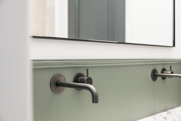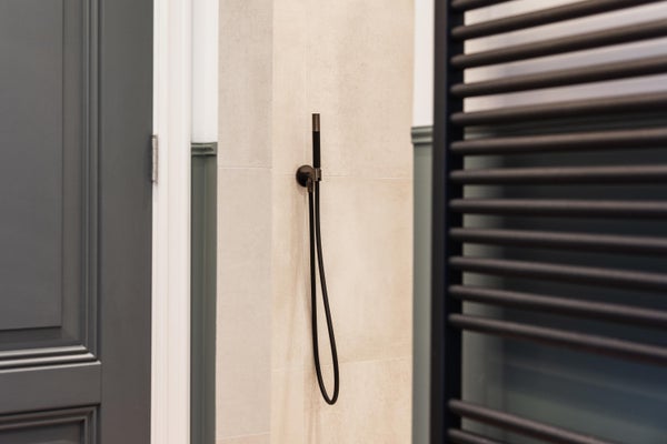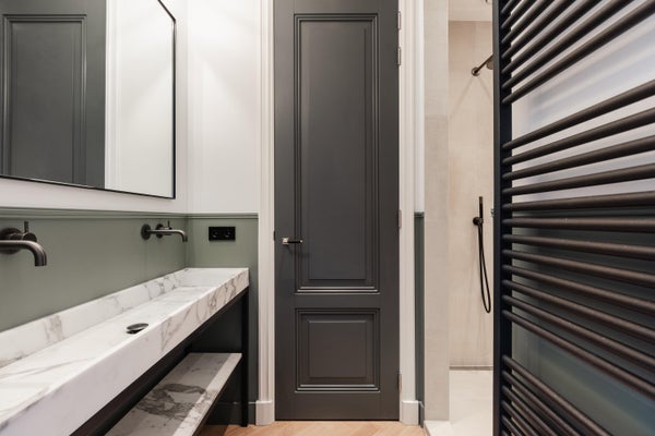 De luxe badkamer is centraal gelegen en voorzien van een dubbele marmeren wastafel, inloop-regendouche en Hotbath-kranen. Verder is er een separaat toilet en een aparte ruimte voor wasmachine en droger.