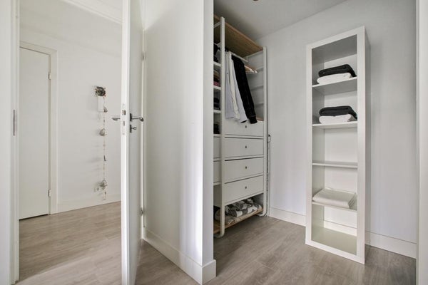 Aan de achterzijde ligt een ruime slaapkamer met inloopkast en directe toegang tot het balkon. Het balkon kijkt uit over de binnentuin en heeft de hele dag zon door de zuidwestelijke ligging.