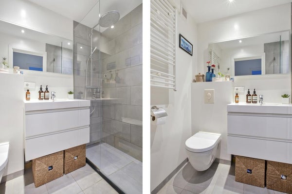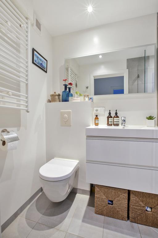 Midden in het appartement bevindt zich de badkamer met inloopdouche met regendouche, wastafelmeubel, handdoekradiator en zwevend toilet.