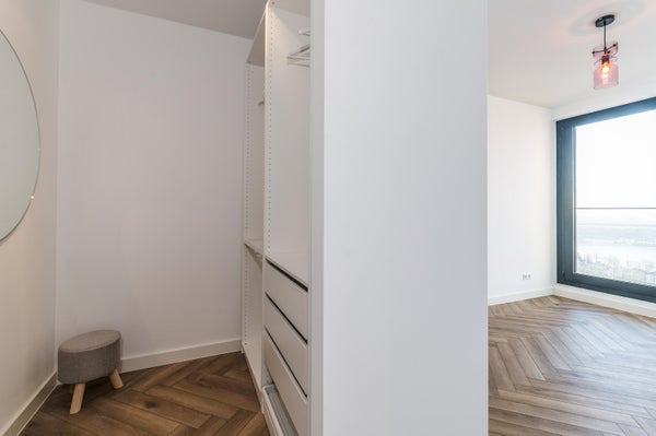 Het appartement beschikt over twee slaapkamers, waarvan de master bedroom is voorzien van een ingebouwde kledingkast. De tweede slaapkamer kan ideaal gebruikt worden als gastenverblijf of kantoorruimte en biedt tevens een prachtig uitzicht over het IJ. De badkamer is hoogwaardig afgewerkt met grote tegels, een inloopdouche, een bad, dubbele wastafel en toilet. Daarnaast is er een aparte wasruimte met een nieuwe wasmachine en droger, die tevens als berging kan dienen.