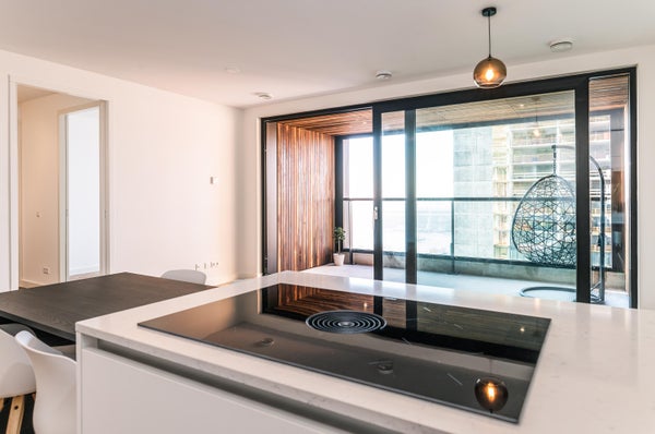 De lichte woonkamer met open keuken biedt volop ruimte voor ontspanning én gezelligheid, met een praktische bar aan de keuken. De moderne, luxe keuken is voorzien van alle gemakken, waaronder een BORA-afzuigsysteem en een Quooker. Via de schuifpui bereikt u het zonnige balkon van ca. 11 m² gelegen op het zuidwesten, waar u kunt genieten van de zon én het panoramische uitzicht over Amsterdam centrum.