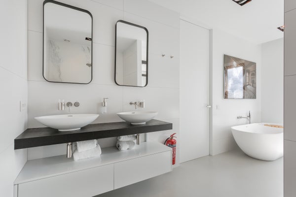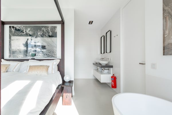 Tweede woonlaag: hoofdslaapkamer met een geweldig bad met uitzicht, luxe en-suite badkamer voorzien van dubbele wastafel en inloopdouche, separaat toilet, twee extra slaapkamers en een tweede royale en complete badkamer badkamer met bad, inloopdouche en dubbele wastafel.