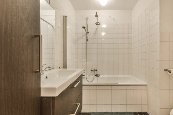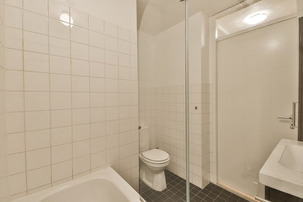 De moderne badkamer beschikt over een ligbad, wastafel(meubel) en toilet. Daarnaast is er een separaat tweede toilet en een aparte wasruimte met berging. De derde slaapkamer grenst aan de woonkamer.