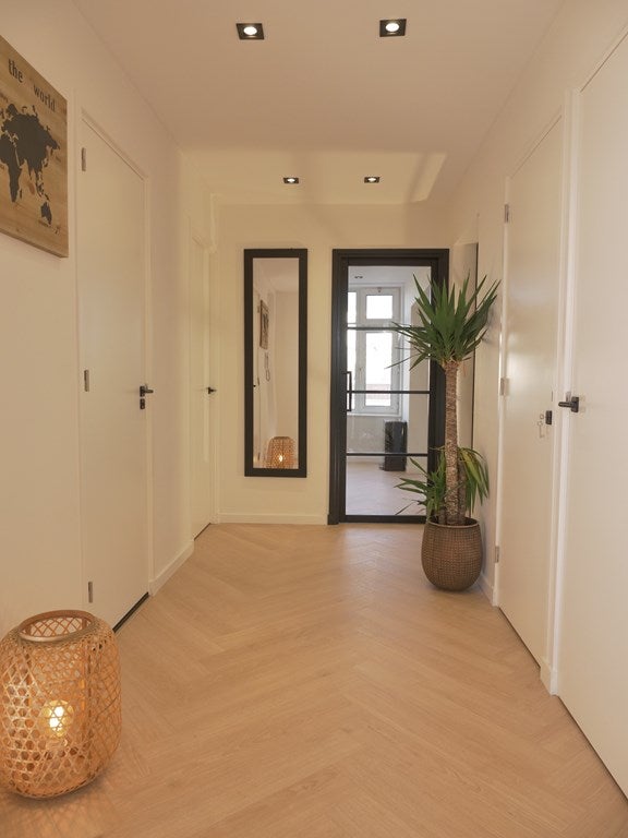 De separate wc en de bergkast liggen centraal in de woning. Verder vind je in de hal de was-/droog combinatie en de CV ketel. Door het gehele appartement ligt vloerverwarming en zijn de plafonds voorzien van inbouwspots. De vloeren zijn voorzien van een visgraad houten vloer.
