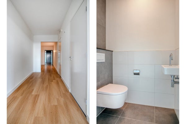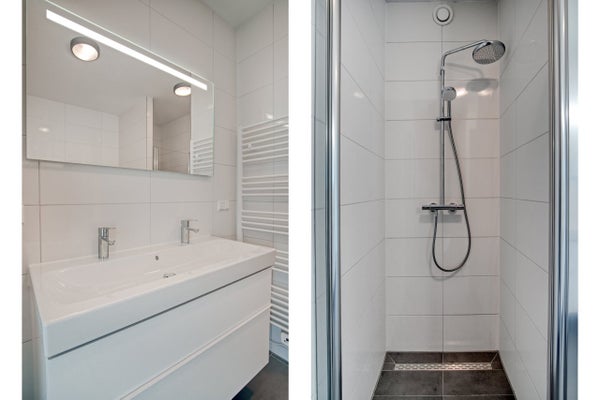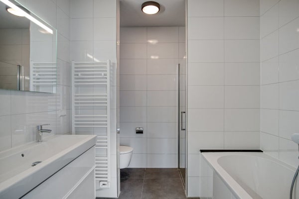 Bij binnenkomst in de hal vindt u een separaat toilet en een ruime berging, handig voor extra opslag. De woning beschikt over een grote slaapkamer en een moderne badkamer met een dubbele wastafel, inloopdouche en ligbad.