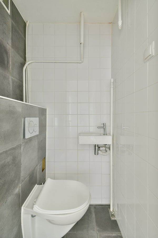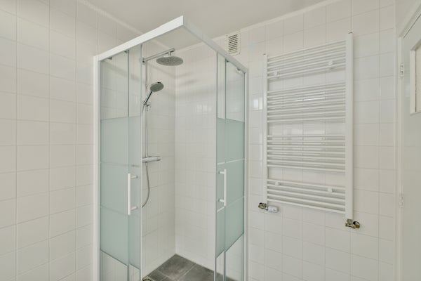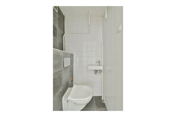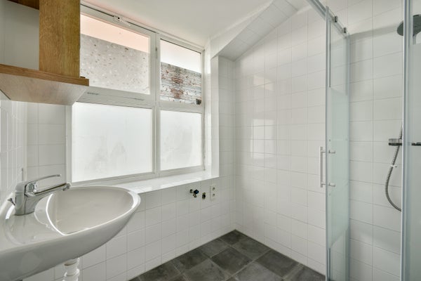 De badkamer is uitgerust met een wastafelmeubel en een douchecabine. Daarnaast is er een separaat toilet aanwezig.