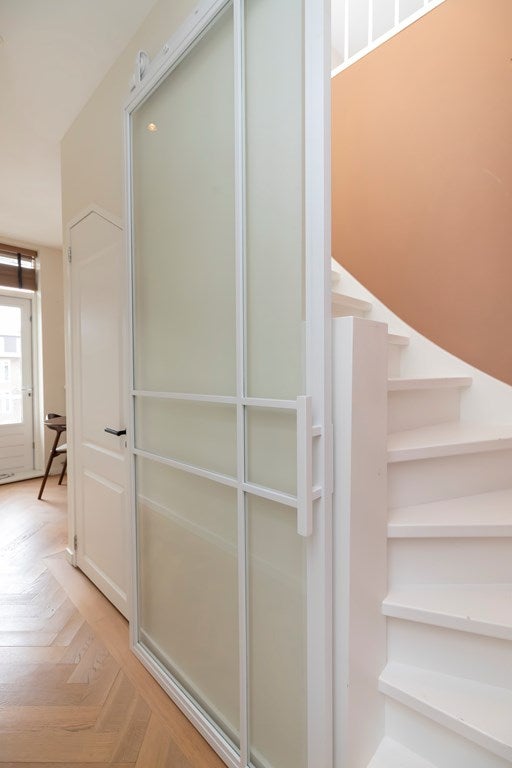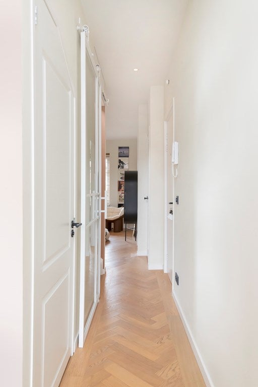 De ingang bevindt zich op de derde verdieping, waar u de lichte woonkamer binnenstapt met grote ramen die uitkijken op de gracht. De moderne open keuken is volledig uitgerust met inbouwapparatuur, en van hieruit heeft u toegang tot het op het oosten gerichte balkon.