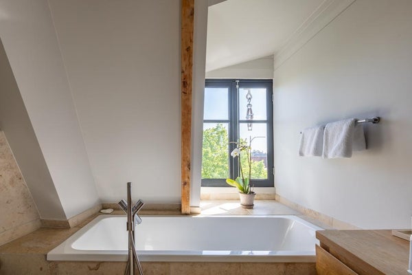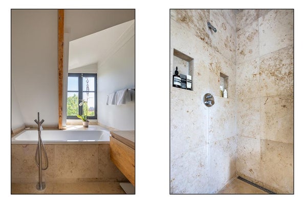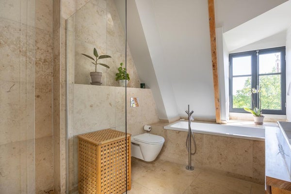 De moderne badkamer bevindt zich in het midden van de verdieping en is van marmer. De badkamer heeft vloerverwarming, een ruime inloopdouche, bad, 2e toilet en een moderne dubbele wastafel met spiegelkasten.