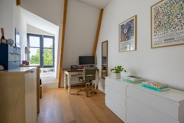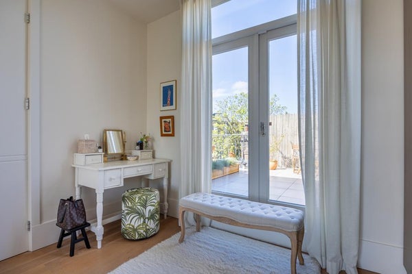 Ruime overloop met toegang tot 2 slaapkamers en een badkamer. De ruime master bedroom heeft een inbouwkast, met een ingebouwde Samsung Frame TV, en biedt toegang tot het ruime dakterras.