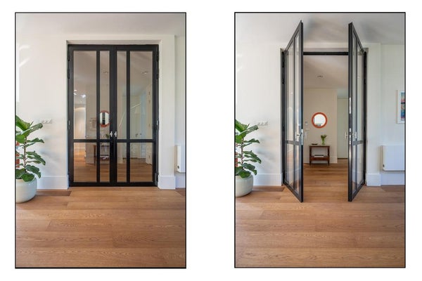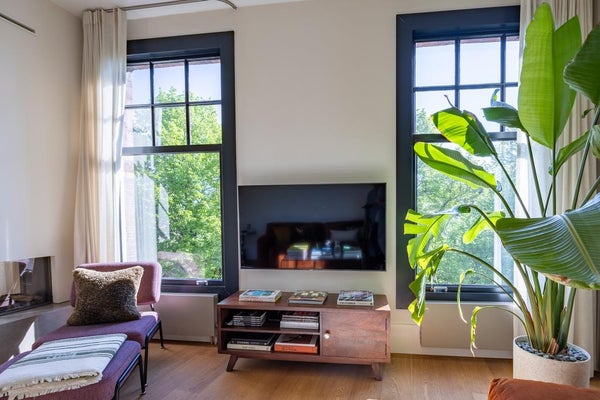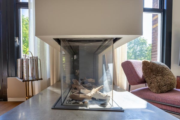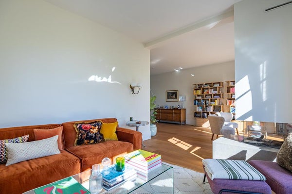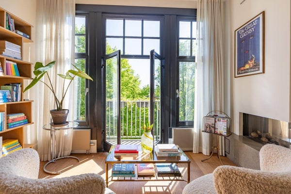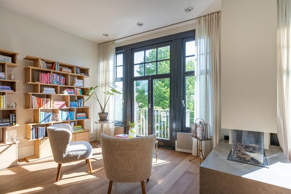 De ruime woonkamer is bereikbaar via dubbele stalen deuren. Wat opvalt zijn de hoge plafonds en de vele ramen aan beide zijden, die zorgen voor veel licht.