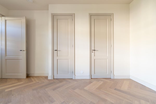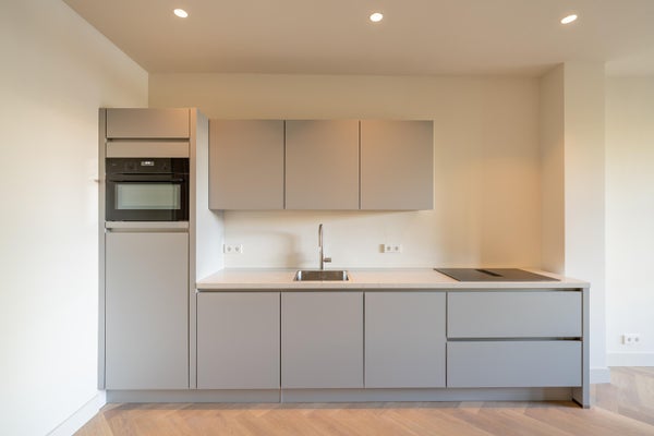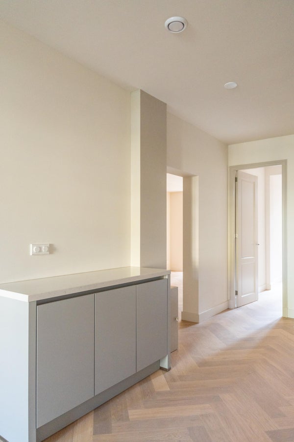 Deze royale woonkamer met open keuken bevindt zich aan de voorzijde van het appartement, met prachtig uitzicht over de Westlandgracht. De luxe keuken is voorzien van diverse inbouwapparatuur, waaronder een koelkast met vriesvak, vaatwasser, 5-pits inductiekookplaat en combi-oven/magnetron.