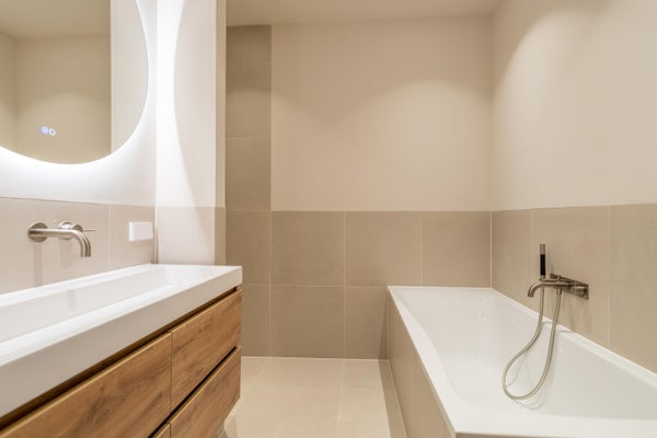 Aan de achterzijde ligt een heerlijke tuin, perfect om te ontspannen. De twee slaapkamers bevinden zich eveneens aan de achterzijde, en de badkamer is uitgerust met een inloopdouche en een stijlvol wastafelmeubel. Het gehele appartement beschikt over comfortabele vloerverwarming.