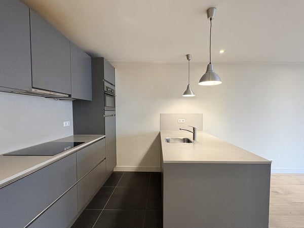 Het appartement heeft een moderne en strakke afwerking en is voorzien van hoge plafonds en grote ramen die veel natuurlijk licht binnenlaten. De ruime woonkamer biedt een open en gezellige sfeer, ideaal om te ontspannen of gasten te ontvangen. De halfopen keuken is volledig uitgerust met hoogwaardige inbouwapparatuur en beschikt over voldoende kastruimte, ideaal voor iedereen die graag kookt.