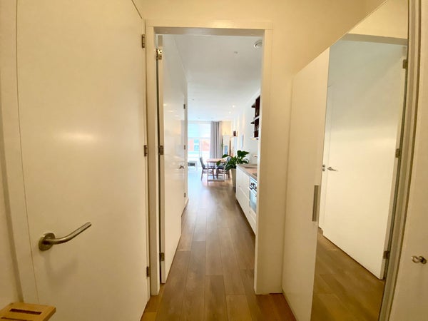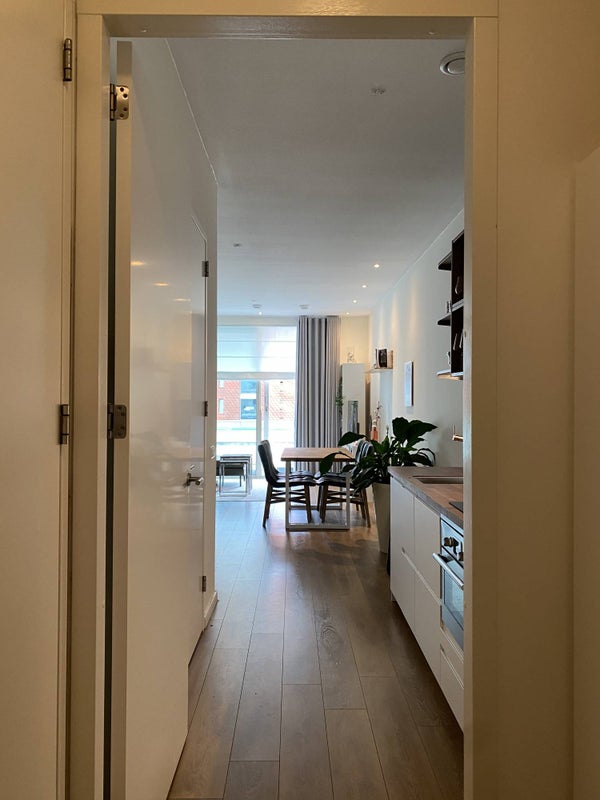 Je komt binnen in de hal waar zich tevens de kledingkast bevindt. Aan de linkerhand is de deur naar de opbergruimte waar de wasdroogcombinatie en WTW installatie te vinden zijn. Bij binnenkomst van de woning bevindt de keuken zich aan de rechterhand met hiertegenover de toegang tot de badkamer. Vervolgens loop je het woon- en slaapgedeelte in, waarbij het ruime tweepersoonsbed direct aan de linkerhand te vinden is. Het slaapgedeelte is afgescheiden van de woonkamer door een vakkenkast, waardoor het natuurlijk licht ook dit gedeelte kan bereiken. Het woongedeelte bevindt zich aan de grote raampartij, waardoor je vanaf de bank kunt genieten van het uitzicht over de Zuidas.