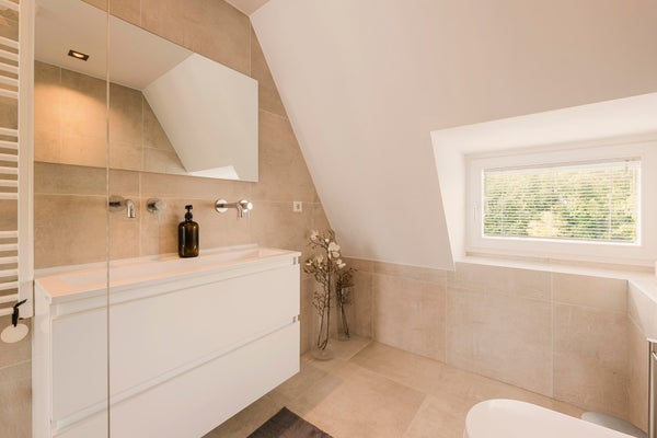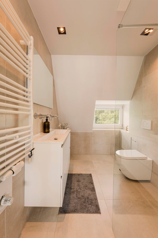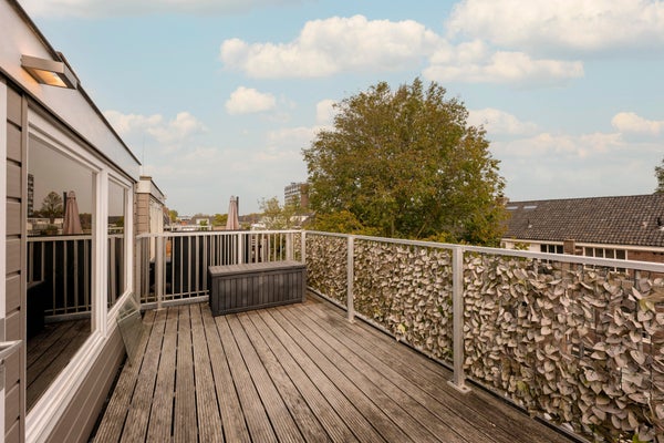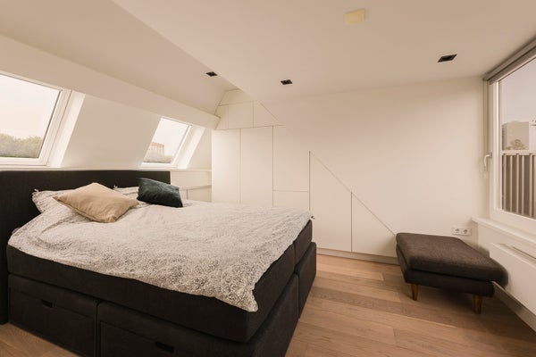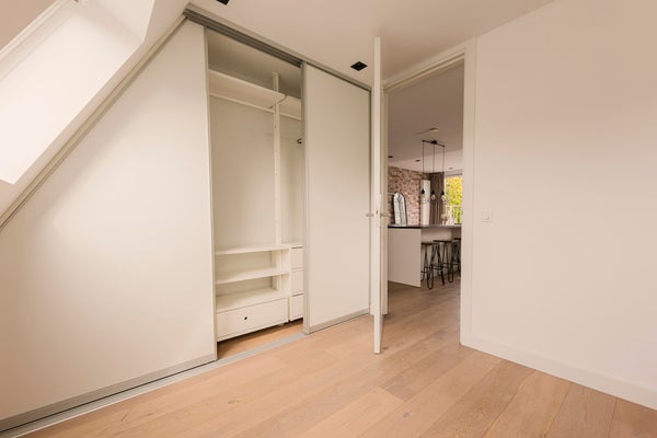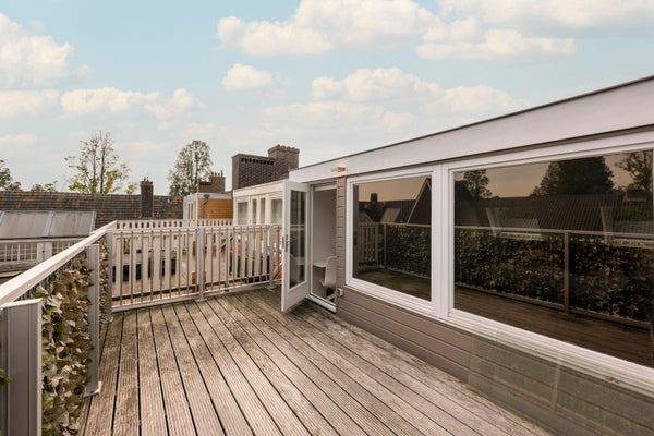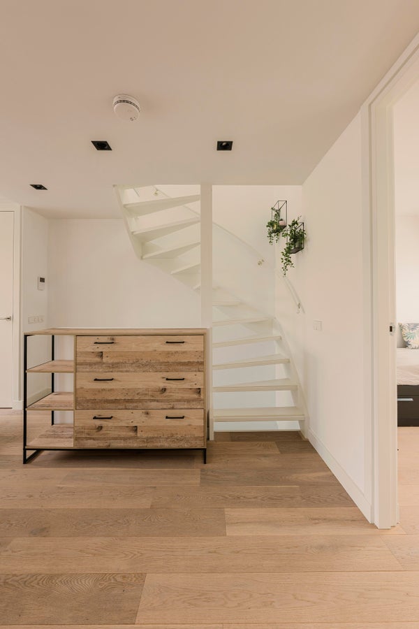Het appartement is verdeeld over twee etages. Op de eerste etage vind de woonkamer met een aangrenzend balkon, een slaapkamer en ruime badkamer met inloopdouche en dubbele wastafels. Op de bovenste etage vind je de grootste slaapkamer, een plek voor de wasmachine, een slim gecreëerde werkplek en het DAKTERRAS!