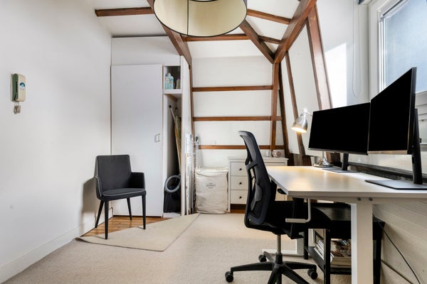 Je betreedt de woning via de entree en gaat met de trap omhoog naar de eerste woonlaag. Aan de rechterzijde bevindt zich de lichte woonkamer, ingericht met een comfortabele hoekbank en grote raampartijen die zorgen voor veel natuurlijk daglicht. Recht tegenover de entree vind je de gezellige eethoek en de moderne hoekkeuken, die is voorzien van alle gemakken. Vanuit hier heb je toegang tot het zonnige terras, ingericht met fijne bankjes, een heerlijke plek om te ontspannen. Op de tweede woonlaag bevindt zich de master bedroom met een ruim tweepersoonsbed en een grote kastenwand. Ook hier zorgen de grote raampartijen voor een prettige, lichte sfeer. Daarnaast is er een tweede slaapkamer, praktisch ingericht als kantoor en ideaal voor thuiswerkdagen. Verder is er een badkamer aanwezig, voorzien van heerlijk ligbad en toilet. Op deze verdieping bevinden zich tevens de wasmachine en droger, wat het wooncomfort compleet maakt.