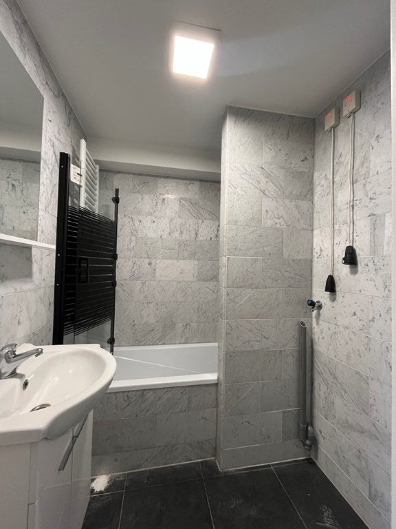 De badkamer is voorzien van een baddouche, wastafel en een aansluiting voor de wasmachine/droger. Separaat toilet aanwezig.