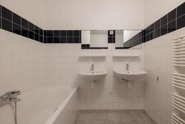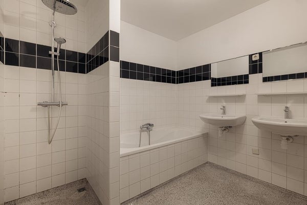 De ruime badkamer is voorzien van vloerverwarming, inloopdouche, bad en twee wastafels.