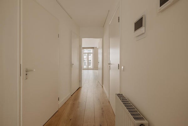 Upon entering via the communal staircase or lift on the second floor. The hall with separate toilet gives access to all rooms. The spacious living room is located at the front of the flat with three large windows that provide plenty of light and two French doors. The spacious open kitchen is equipped with all appliances such as a fridge, freezer, oven, microwave and dishwasher.