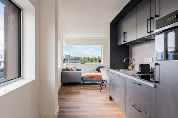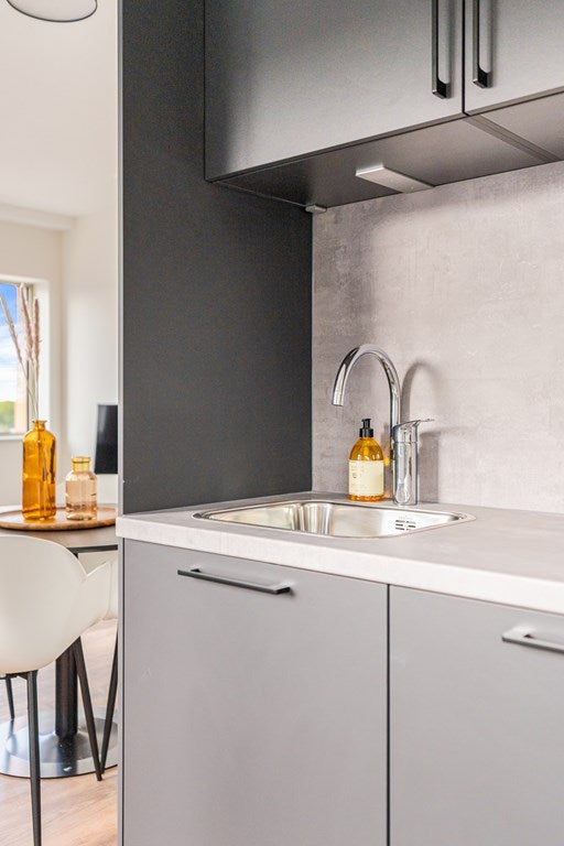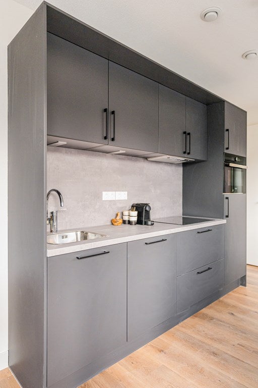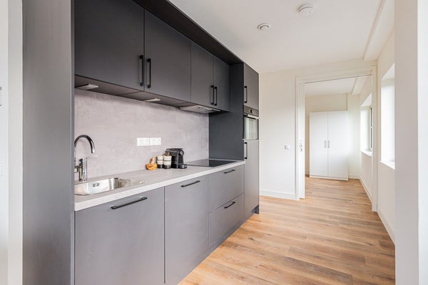 Vanuit de slaapkamer loopt u door naar de open keuken, die is uitgerust met diverse inbouwapparatuur en voldoende werkruimte. De keuken staat in open verbinding met de lichte en ruime woonkamer, waar grote ramen zorgen voor een prettige hoeveelheid daglicht en een uitnodigende sfeer.