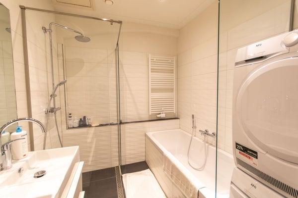 Badkamer: Badkuip, aparte douche, dubbele wastafel, wasmachine en droger.
