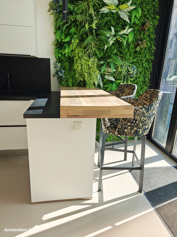 Moderne open keuken, voorzien van een stijlvol keukenblok met hoogwaardige inbouwapparatuur.