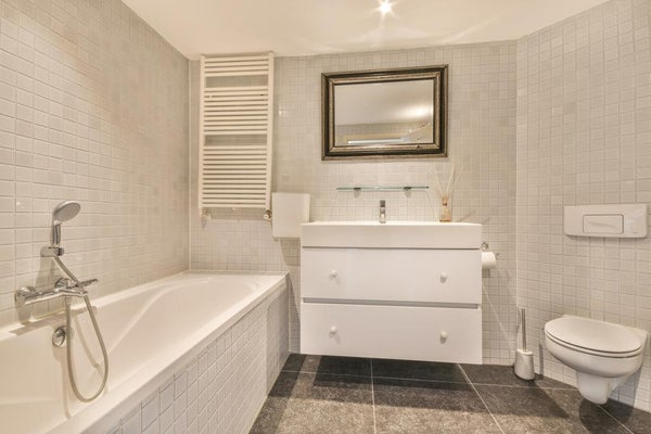 Centraal in het appartement bevindt zich een praktische wasruimte met wasmachine, droger en ingebouwde kast. De badkamer is uitgerust met een douche, ligbad, toilet en wastafelmeubel.