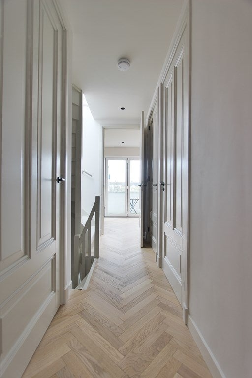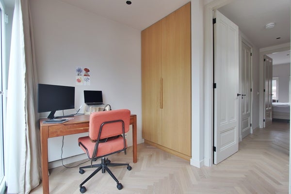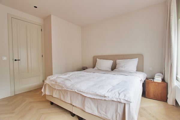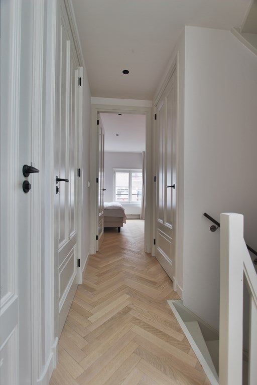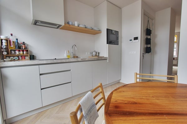 Woonkamer aan de voorkant, aan de achterkant open keuken en balkon. Keuken (GAGGENAU) uitgerust met alle inbouwapparatuur, inclusief een Quooker voor direct heet water. Afzonderlijke ruimte met wasmachine en droger. Trap naar de 3e verdieping. Overlay. Hoofdslaapkamer uitgerust met een tweepersoonsbed en inbouwkasten. Tweede slaapkamer met tweede balkon, waarin een tweepersoonsbed past en met inbouwkasten. Apart toilet met wastafel. Badkamer (met vloerverwarming) met inloopdouche plus regendouche. Wastafel met meubels, volledig op maat gemaakt.