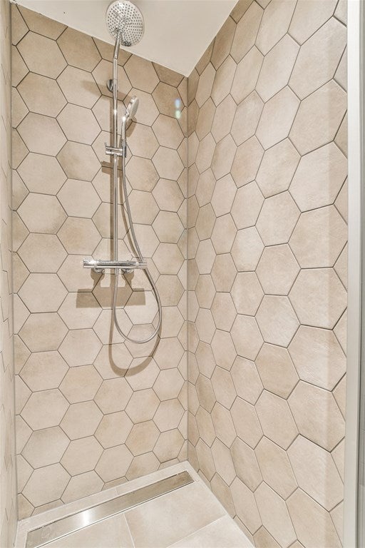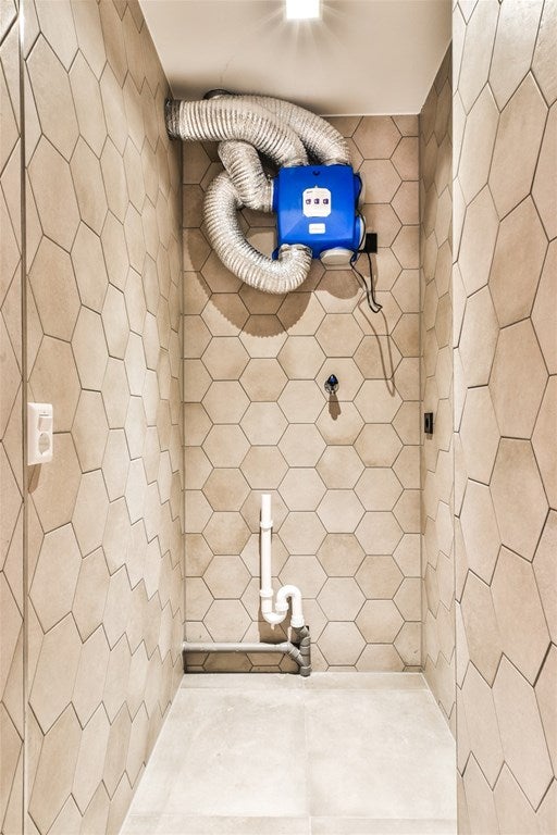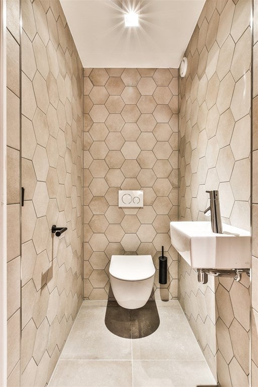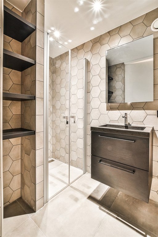 - de badkamer met hoogwaardige afwerking, wastafel, inbouwkast en inloopdouche