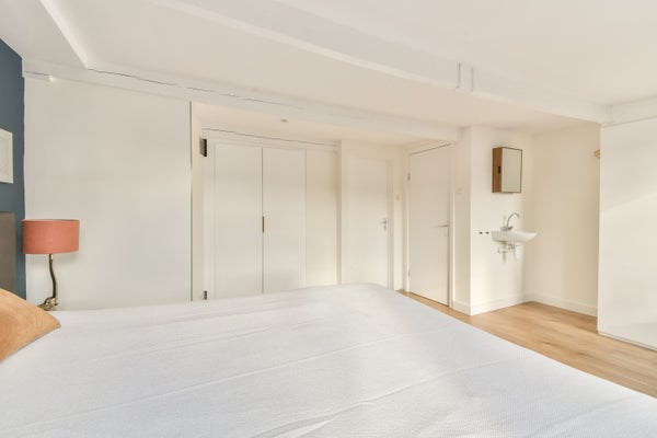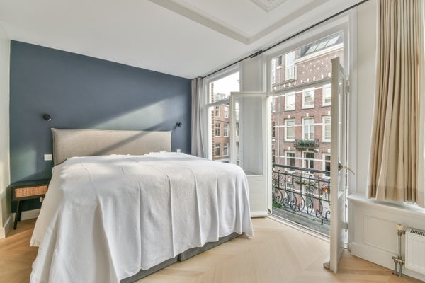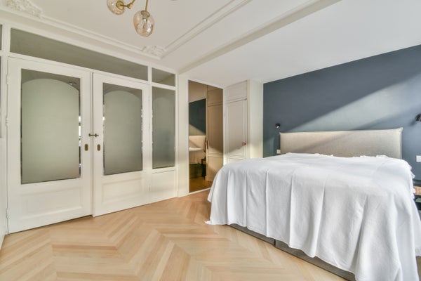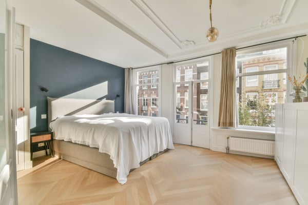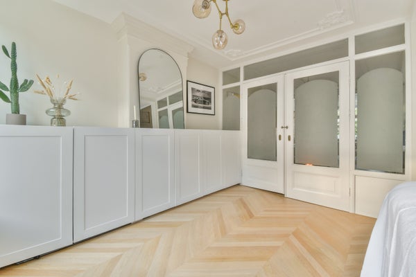 De authentieke houten ensuite deuren met glas scheidt de woonkamer van de royale slaapkamer aan de voorzijde, die is voorzien van op maat gemaakte luxe inbouwkasten. Het charmante Frans balkon biedt een fraai uitzicht en versterkt de lichte, luchtige sfeer van de ruimte, terwijl het glas het daglicht optimaal doorlaat en de ruimtelijke beleving verfijnd houdt.