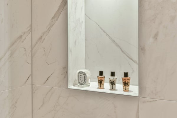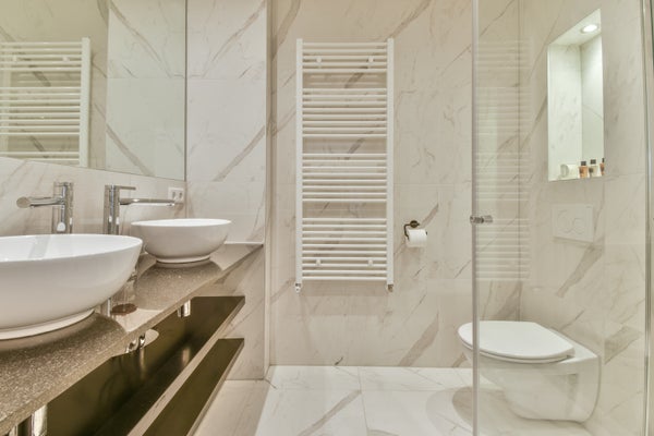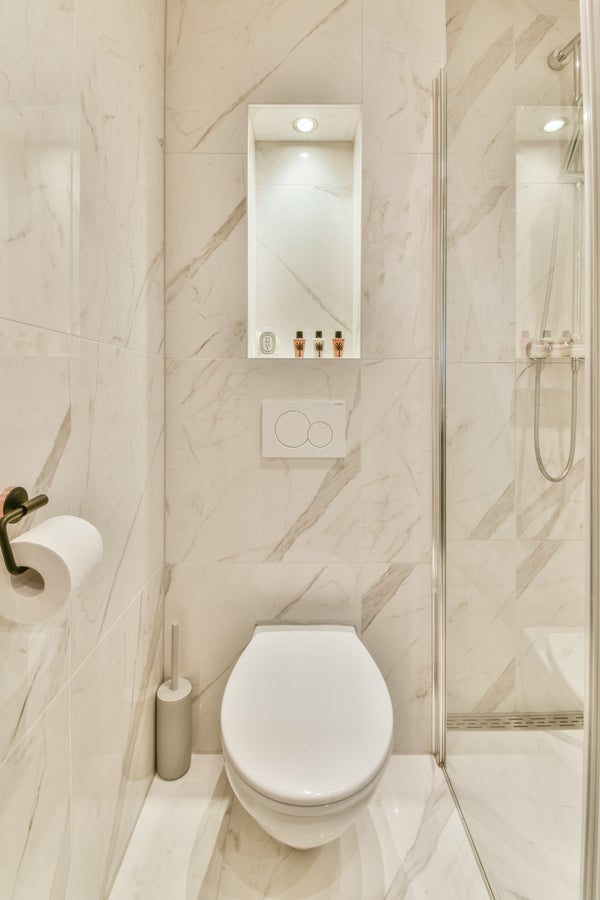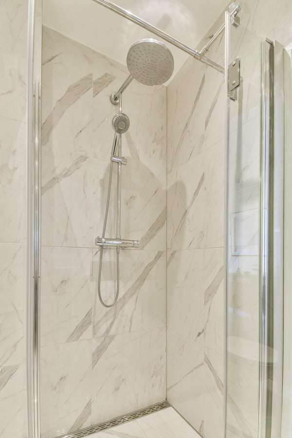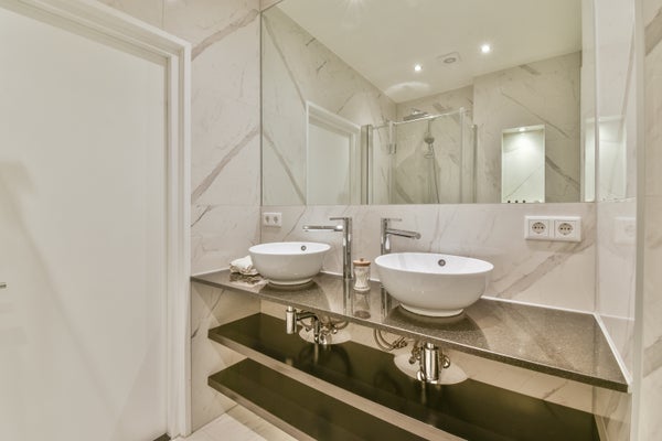 De centraal gelegen luxe badkamer is uitgerust met een inloopdouche, toilet en wastafelmeubel, en vormt een stijlvolle en functionele oase van rust.