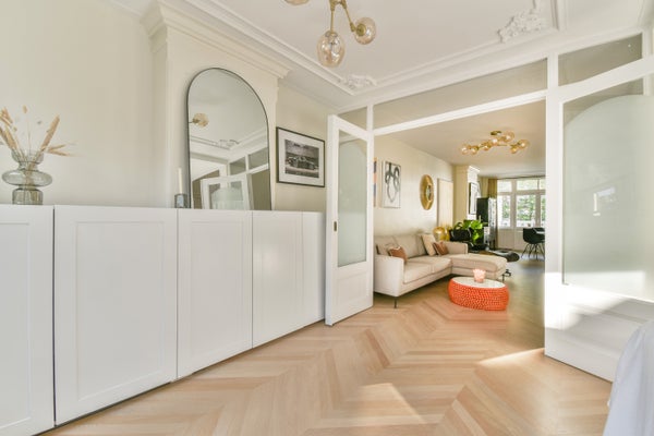 Het natuurlijke licht stroomt van voor naar achter en valt prachtig op de lichte parket vloer met Hongaarse punt en de strakke wandafwerking, waardoor de ruimtes extra luchtig en uitnodigend aanvoelen. Aan de achterzijde van het appartement geven openslaande deuren toegang tot een balkon met avondzon.