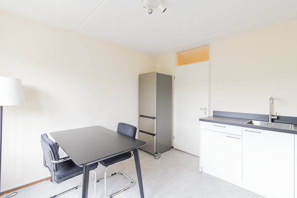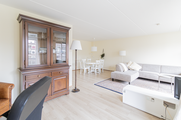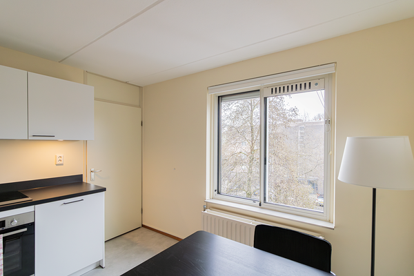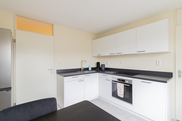 De woonkamer is ruim en biedt toegang tot het balkon dat is gelegen op het westen. De volledig gemeubileerde woonkamer beschikt over rolluiken en zonneschermen zodat er volledige privacy gecreëerd kan worden. De nieuwe separate keuken is van alle gemakken voorzien, zoals een koel-vriescombinatie, inductiekookplaat, oven, vaatwasser en afzuigkap. Tevens is de keuken voorzien van een gezellige eethoek. De keuken biedt toegang tot de inpandige berging en is voorzien van een wasmachine, droger en de cv-ketel. Tevens bevindt zich hier ook nog eens extra opbergruimte.