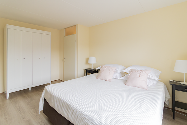 De grote slaapkamer is uitgerust met een tweepersoonsbed en kledingkast. De tweede slaapkamer beschikt over een eenpersoonsbed, bureau met bureaustoel, een hangkast en een boekenkast. Het toilet is gesitueerd op de gang. De badkamer is voorzien van een ligbad, wastafel en inloopdouche. Op de begane grond is een aparte berging beschikbaar, geschikt voor het eventueel stallen van fietsen.