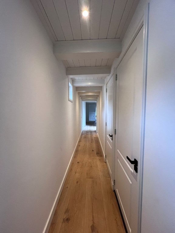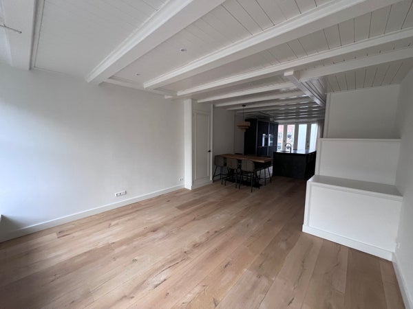 De ruime woonkamer is gevuld met natuurlijk licht en beschikt over zichtbare houten balken en brede houten vloerdelen, die warmte en karakter toevoegen.
