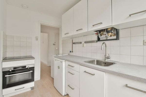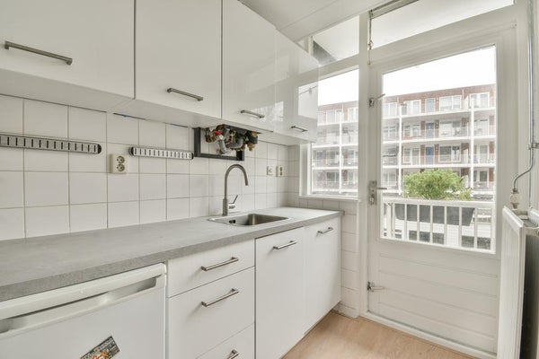 De keuken, ook aan de achterzijde gelegen, is compleet uitgerust met een inductiekookplaat, combimagnetron, vriezer, koelkast, vaatwasser, was-/droogcombinatie en voldoende kastruimte. Zowel vanuit de keuken als beide slaapkamers heeft u toegang tot het balkon. De ruime woonkamer bevindt zich aan de straatzijde.