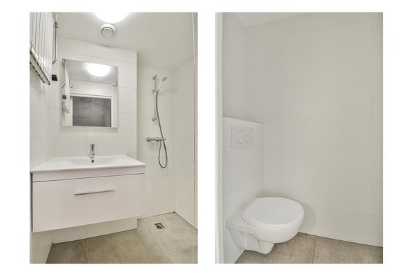 Aan de achterzijde van de woning bevinden zich beide slaapkamers, een apart toilet en de badkamer met inloopdouche en wastafelmeubel.
