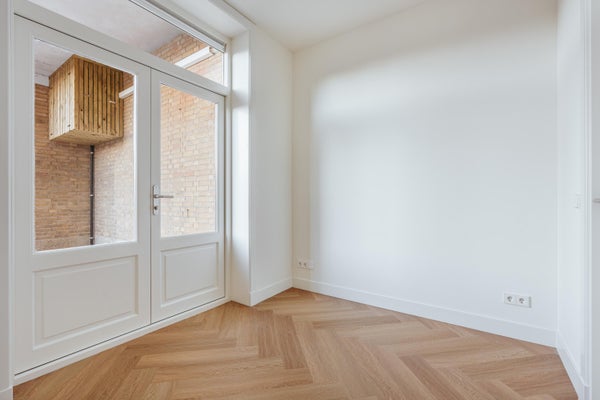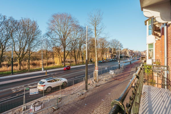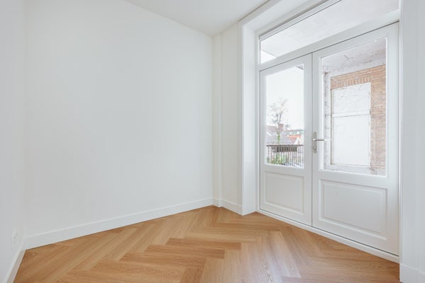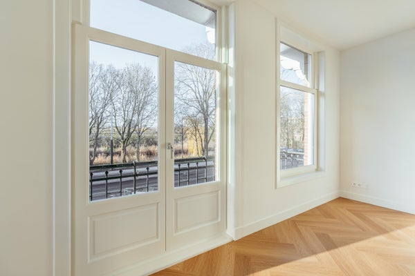 Via de entree op de eerste verdieping betreed je de woning via de centrale hal die toegang biedt tot alle vertrekken. Aan de voorzijde bevindt zich de ruime en lichte woonkamer, met een karakteristieke erker en grote raampartijen. De kamer heeft een open indeling en biedt via dubbele deuren toegang tot het balkon aan de straatzijde. Aangrenzend ligt de keuken, welke is opgesteld in een praktische, langgerekte indeling en beschikt over de benodigde aansluitingen en werkruimte. Aan de rustige achterzijde van het appartement bevinden zich twee ruime slaapkamers. De grootste slaapkamer ligt rechts en biedt voldoende plek voor een groot bed en kastruimte. De tweede slaapkamer ligt links en beschikt over openslaande deuren naar het balkon, met uitzicht op de binnentuinen. De badkamer is centraal gelegen en voorzien van een douche en wastafel. Daarnaast is er een separaat toilet en een CV-ruimte in de hal. Een extra kast biedt plek voor de meterkast en opbergruimte. Kortom: een licht, ruim ingedeeld appartement met twee goede slaapkamers en twee balkons, gelegen op een aantrekkelijke locatie.