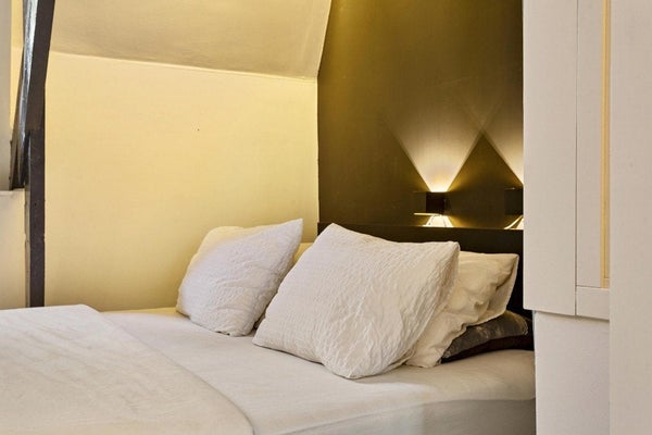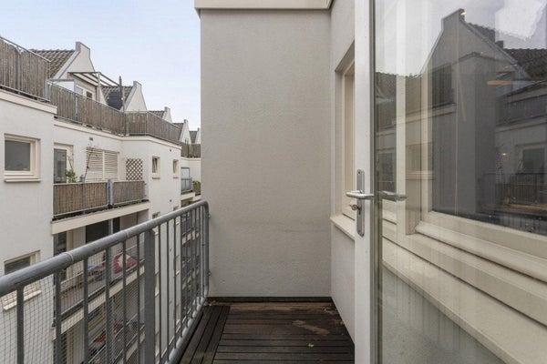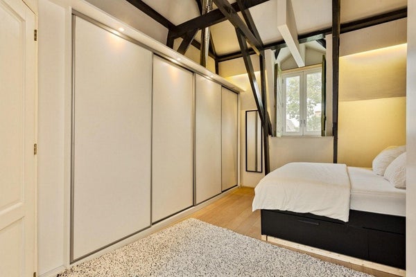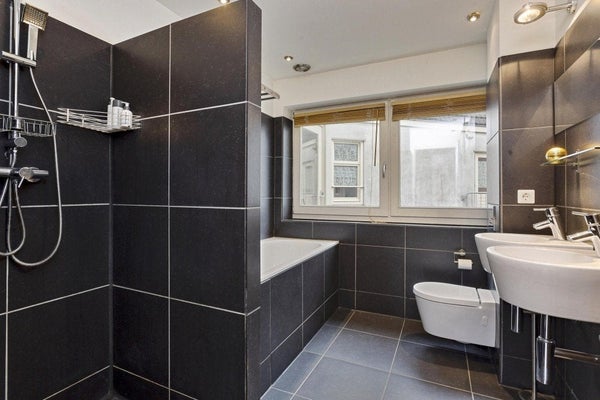 Indeling: entree op de 3e verdieping: hal met toegang tot de eerste slaapkamer aan de straatkant, badkamer met bad, inloopdouche, dubbele wastafel en toilet, centrale verwarming kast, lichte woonkamer met 3 ramen, houten vloer en een open haard, open keuken met kook eiland en diverse apparatuur, toegang tot het balkon gelegen op het zuidoosten. Trappen binnen naar de 4e verdieping: binnenkomst in de master slaapkamer met een vaste kast muur, prachtige frames en balken aan de nok (plafondhoogte van meer dan 4 meter). Kleine slaapkamer aan de achterzijde en naast deze wasruimte met wasmachine en droger verbinding en een tweede toilet en fontein. In de kelder is er een grote prive-opslagruimte of 6,7 m²