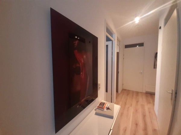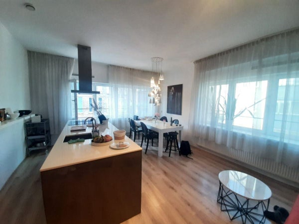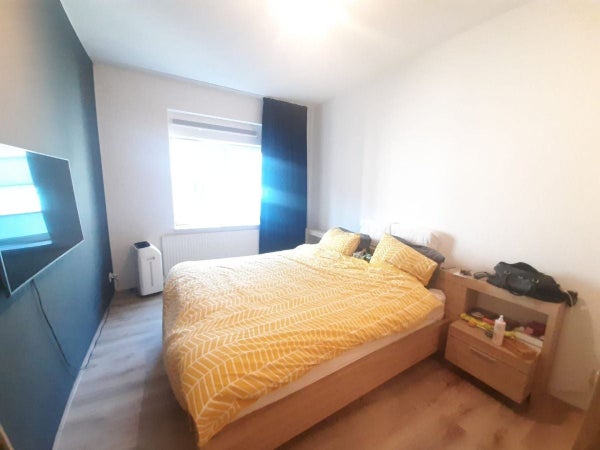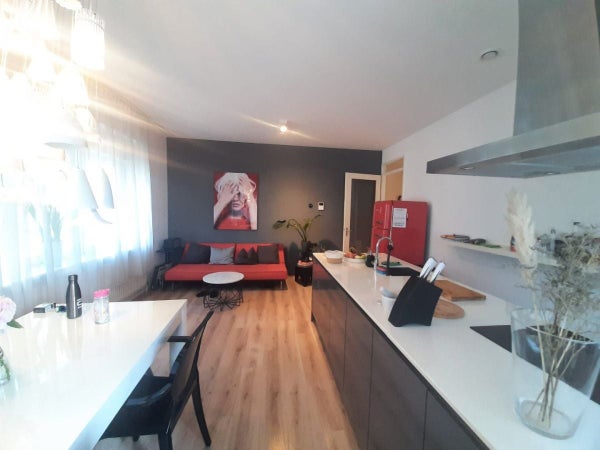 Te huur: volledig gemeubileerd modern appartement van 60m2 met lichte woonkamer met open keuken, 1 ruime slaapkamer, een kleine extra kamer, ruime hal en grote bergruimte, badkamer met douche en aparte toilet.