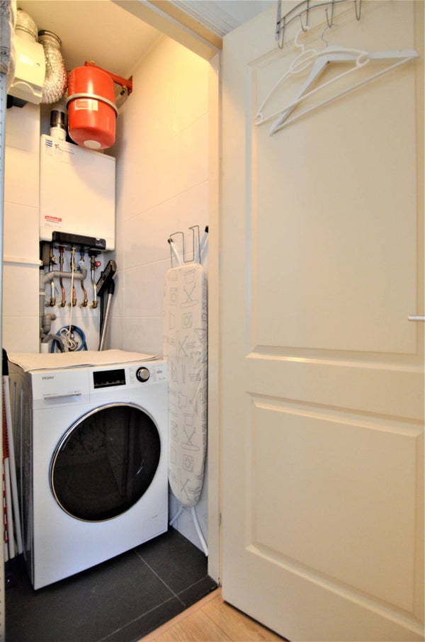 Aan de voorzijde bevindt zich de tweede slaapkamer, ideaal als logeerkamer of home office. Een was-/droogcombinatie is aanwezig.