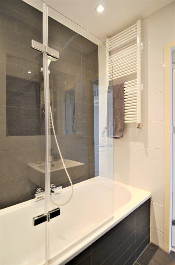 De hoofdslaapkamer bevindt zich eveneens aan de achterzijde en heeft toegang tot het balkon. Centraal in de woning ligt de moderne badkamer met ligbad, wastafel en eerste toilet. Daarnaast is er een separaat tweede toilet.