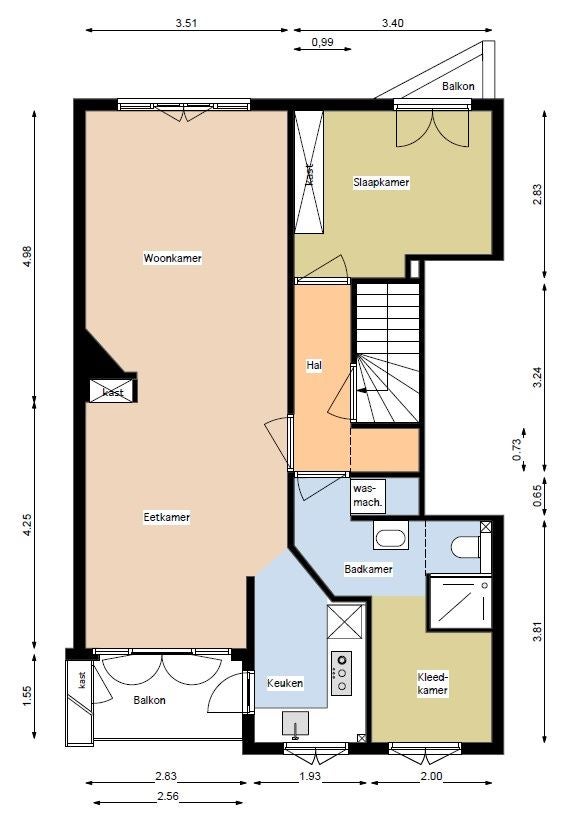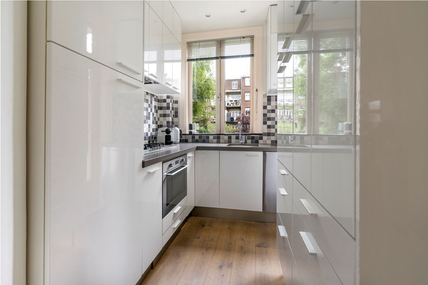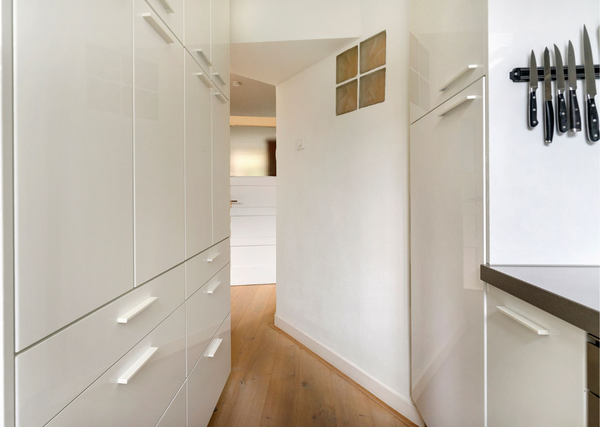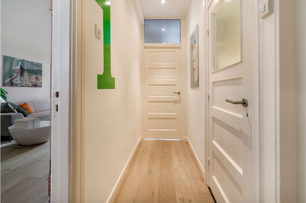 Eigen entree. Hal met toegang tot de woonkamer, slaapkamer (voorzijde) en badkamer. De heerlijk lichte doorzonkamer is onderverdeeld in een woon- en eetgedeelte. Het woongedeelte is gelegen aan de straatzijde en het eetgedeelte biedt middels openslaande deuren toegang tot het balkon aan de achterzijde (zuidwesten). De half open, hoogglans witte keuken is te bereiken via de eetkamer en is modern uitgevoerd.