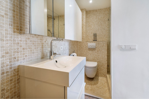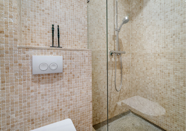 De badkamer is geheel betegeld en voorzien van een wastafelmeubel, zwevend toilet en een inloopdouche. Tevens is er in de badkamer ruimte voor het witgoed apparatuur en aan de badkamer grenst een ruime kleedkamer.