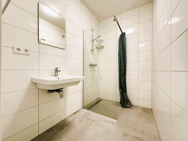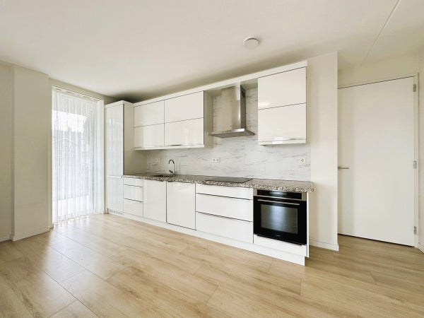 Indeling: Centrale entree met lift naar de 2e etage. Entree van het appartement met hal die toegang biedt tot alle vertrekken. De woonkamer met open keuken is gelegen aan de voorzijde. Vanuit de woonkamer toegang tot het balkon middels openslaande deuren. De keuken is voorzien van een koelkast, vriezer, grote combi-oven, vaatwasser en een inductiekookplaat met afzuigkap. Vanuit de hal toegang tot de zeer ruime slaapkamer. De badkamer beschikt over een inloopdouche en een wastafel. Apart toilet met fonteintje.