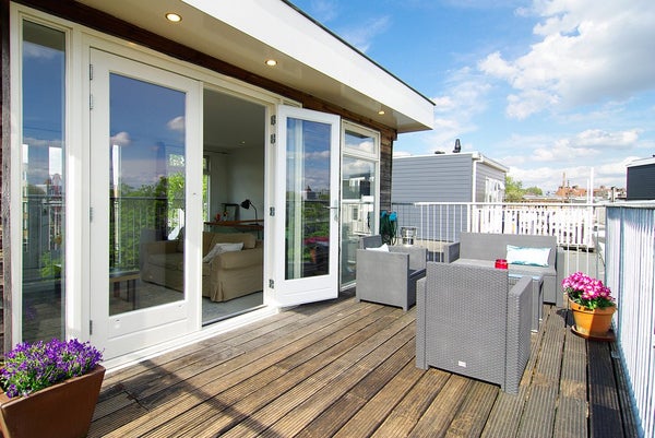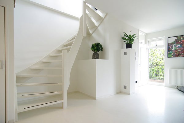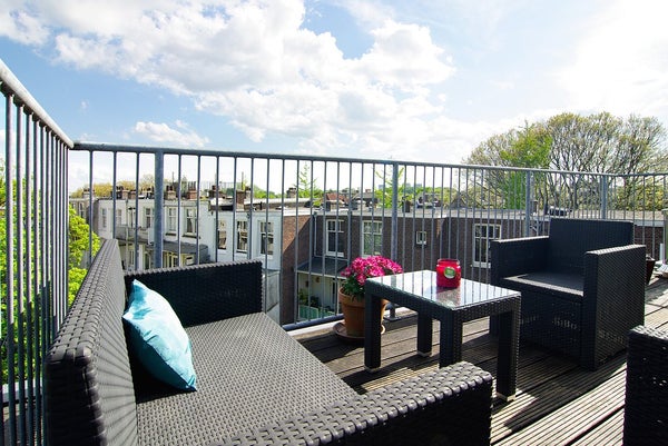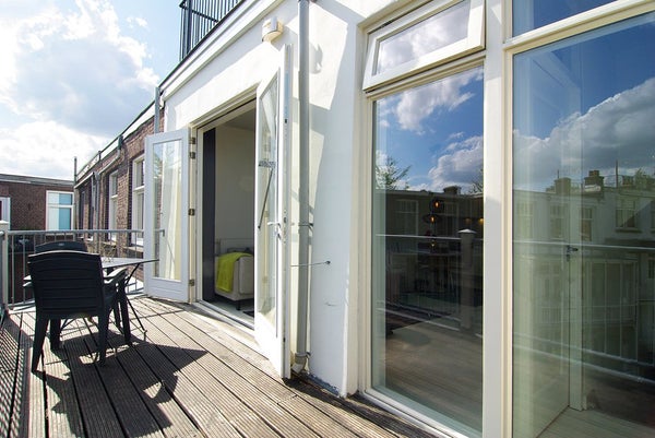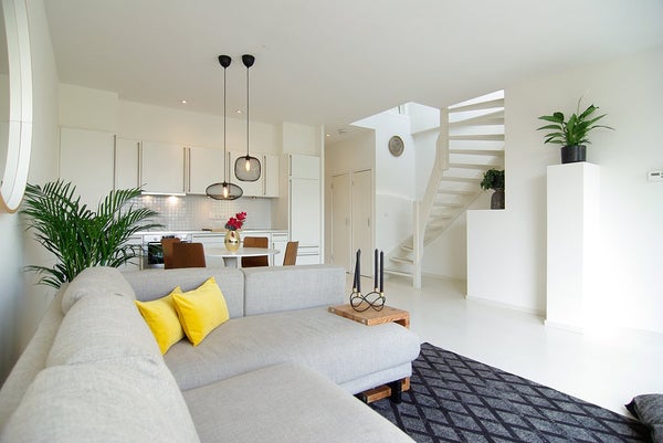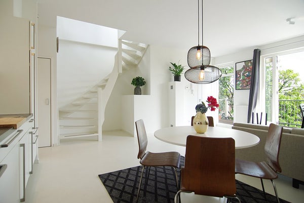 Een moderne open trap leidt naar de bovenverdieping met een extra woonkamer (incl. slaapbank) en directe toegang tot een balkon en een dakterras – de perfecte plek om te ontspannen met wijd uitzicht over de buurt.