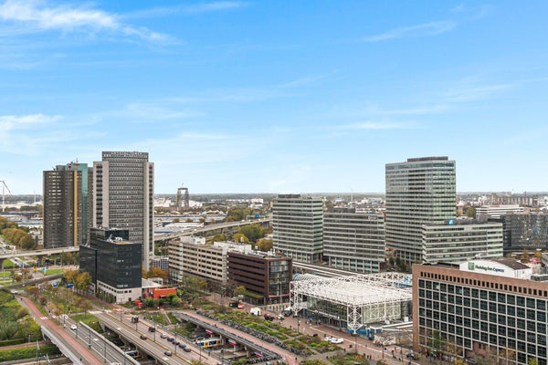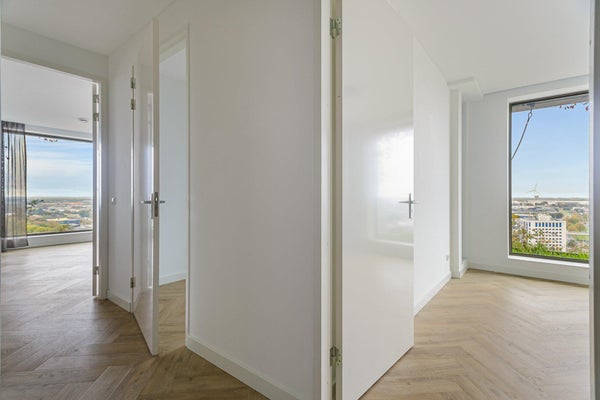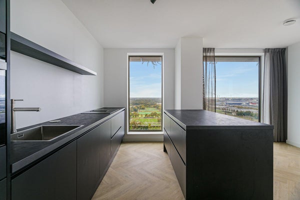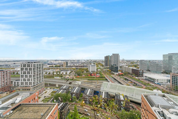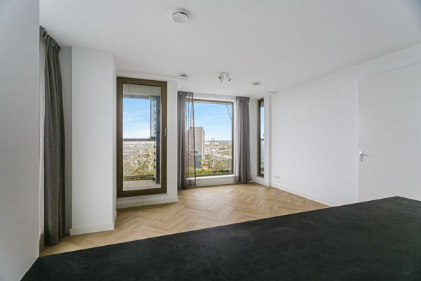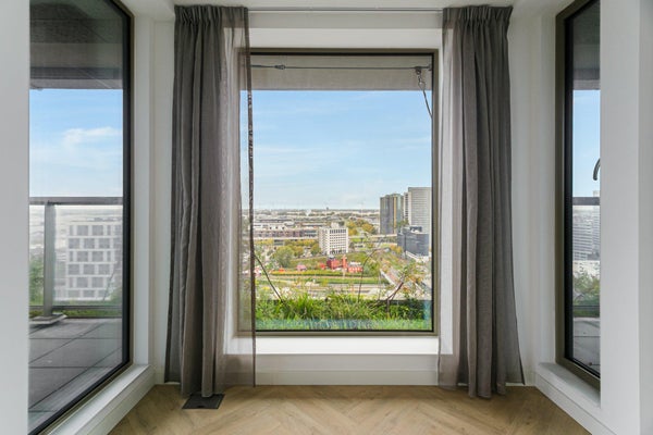 Indeling: Gezamenlijk entree met lift naar de 16e etage. Hal met toegang tot alle vertrekken van het appartement. Separaat toilet en een inpandige berging met aansluiting voor de wasmachine en droger. De woonkamer met luxe open keuken is royaal opgezet en dankzij de hoekligging bijzonder licht. De grote ramen bieden een panoramisch uitzicht over Amsterdam. De moderne open keuken is voorzien van hoogwaardige inbouwapparatuur. De baropstelling maakt het een ideale plek voor een ontbijt of een borrel. Aangrenzend aan de woonkamer bevindt zich een heerlijk balkon, waar je in alle rust kunt genieten van het uitzicht en de hoogte. Het appartement beschikt over twee slaapkamers: een ruime hoofdslaapkamer en een tweede kamer die perfect kan worden ingericht als werk-, logeer- of hobbykamer. De badkamer is modern vormgegeven en uitgerust met een inloopdouche en wastafel.