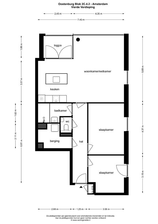 De vierde verdieping is te bereiken via de gemeenschappelijke lift en trappenhuis. Entree, hal die toegang geeft tot de wc, badkamer, twee slaapkamers en de woonkamer. De woonkamer met open keuken en balkon op het westen geniet van een prachtige lichtinval door de grote glazen schuifpui. De keuken met kookeiland is voorzien van alle hedendaagse gemakken. Verder is het appartement voorzien van een inpandige berging. In de benedenbouw is er een ruime fietsenstalling. Parkeerplaatsen in beveiligde parkeergarage op aanvraag.