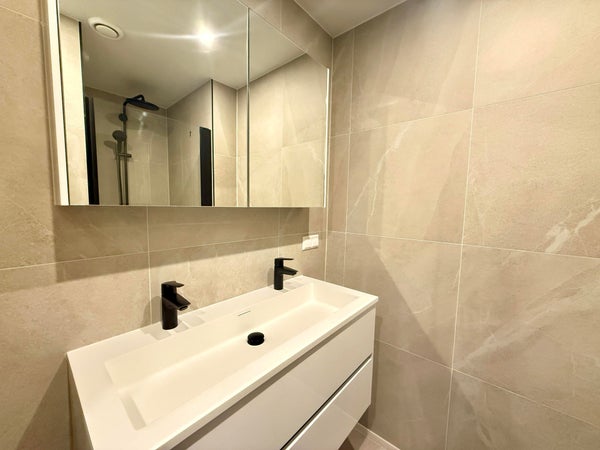 - Eén badkamer met inloopdouche, toilet en wastafel