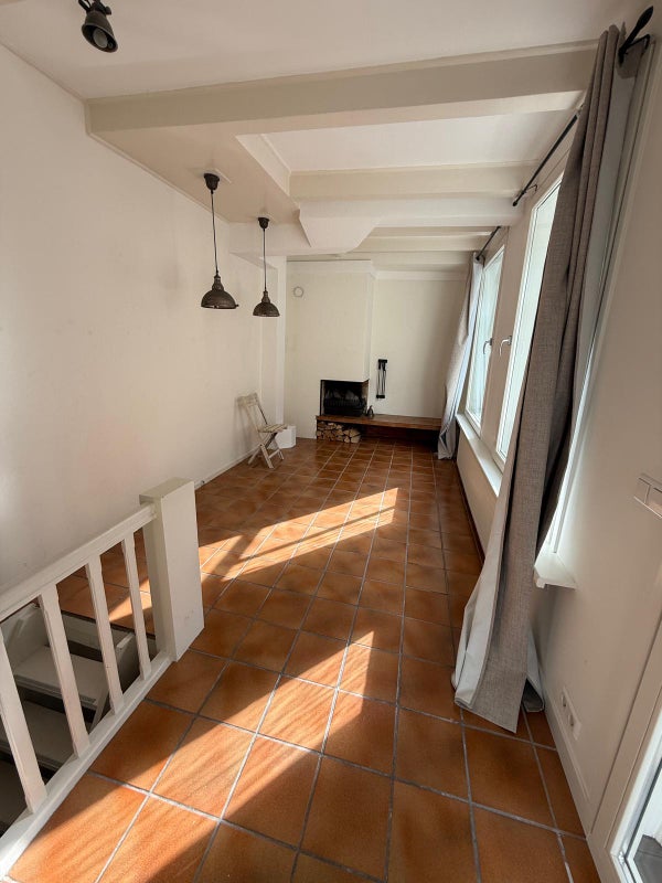 Middels de trap naar boven bereikt u de woonkamer met romantische open haard.